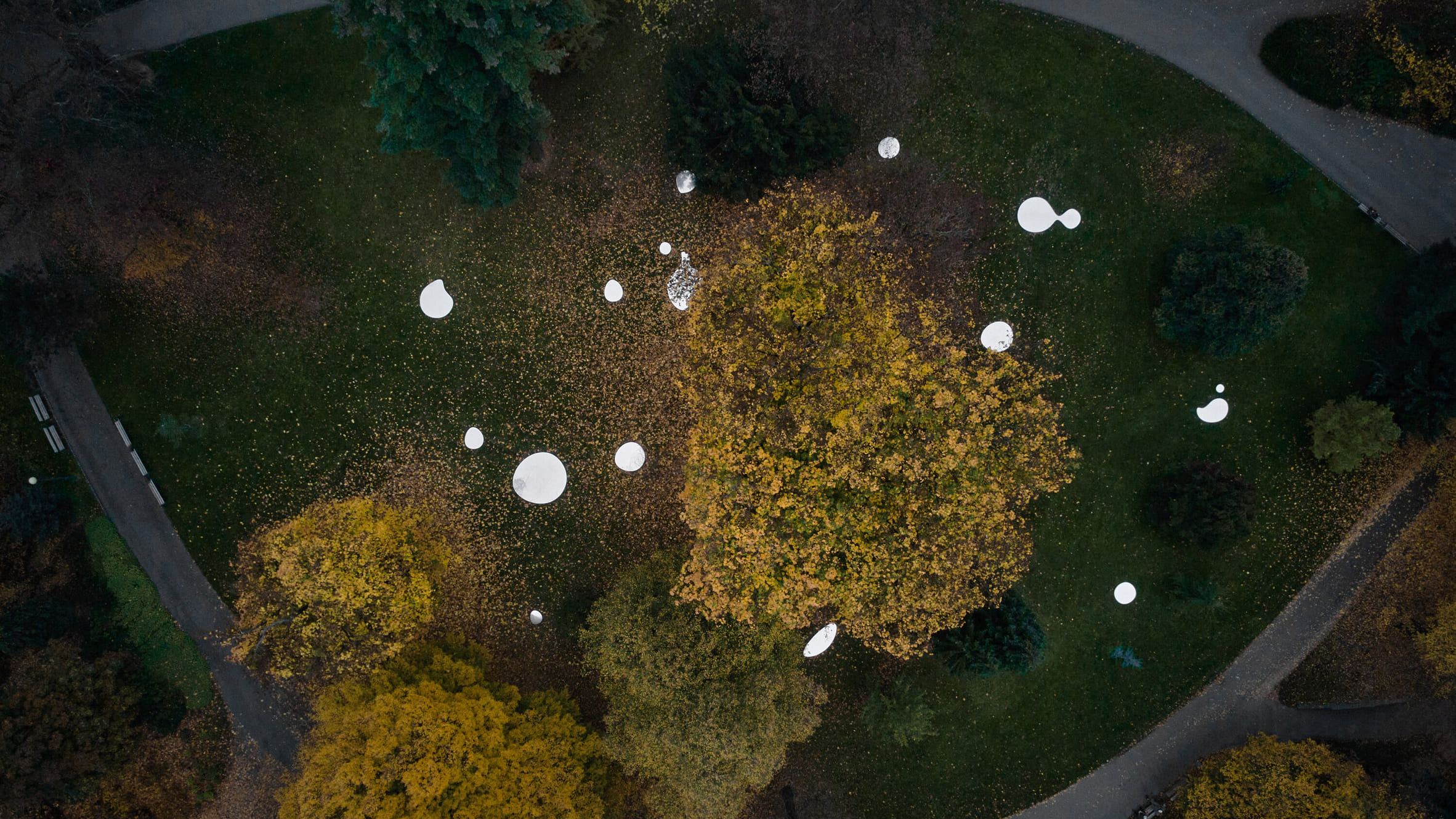 The highlight of the exhibition is a collection of fluid-shaped speakers which are placed among some of the beautiful trees in the park. At dawn we can hear a polyphonic chorus of voices of real and fictional characters from different times and places. At dusk you can hear a sound composition which celebrates cyclical time, the seasons of the year, and also the equinox and solstice.