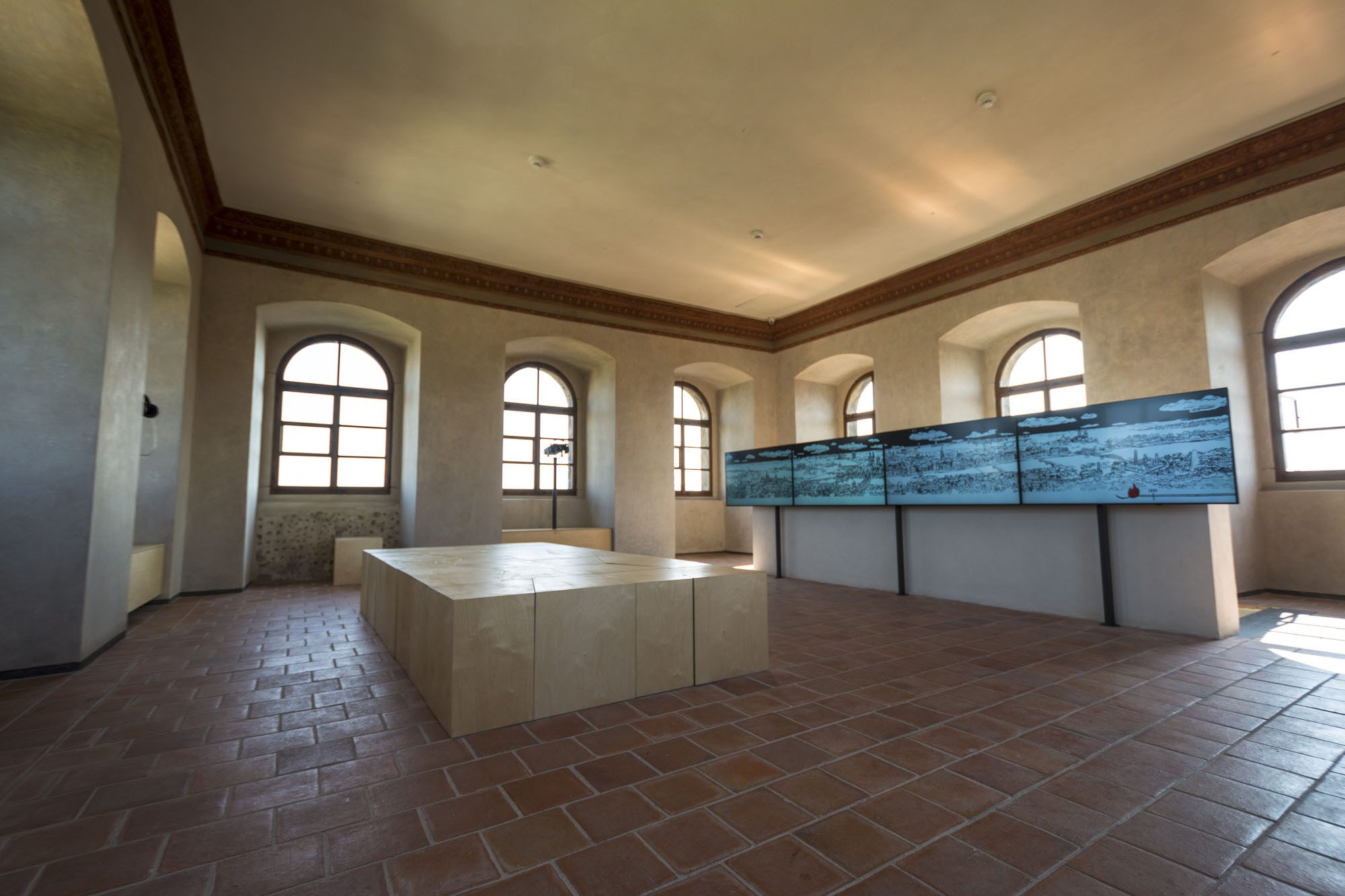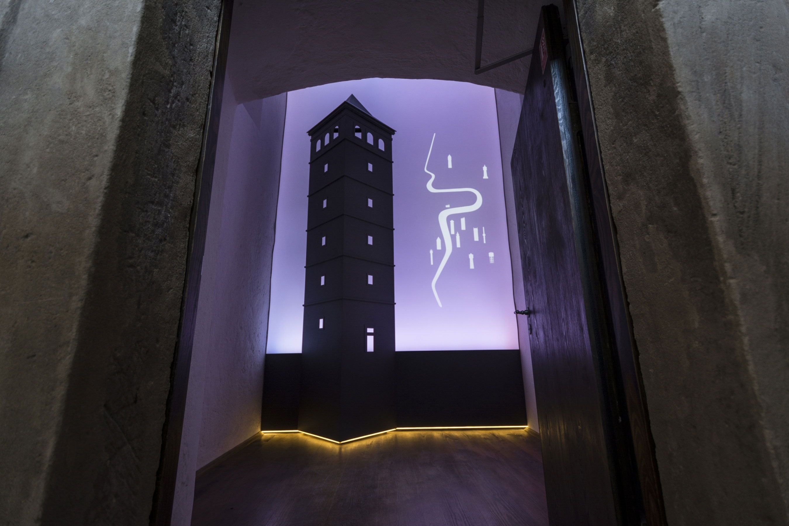 The exhibition is installed in the New Mill Water Tower which is open to the public for the first time ever. It is a technical structure from the second half of the 17th century which provided a water supply to the surroundings of the New Town of Prague. As evidenced by records, a wooden water tower was on the site of today’s tower in the 15th century; a sumptuous stone tower was built between 1602 and 1606 with a lookout area referred to as ‘Lusthaus’ on the top floor.